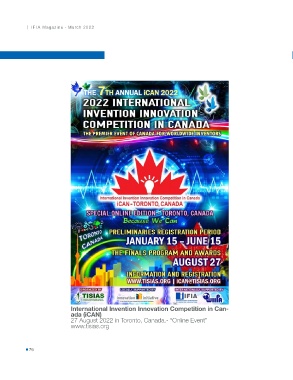 | IFIA Magazine - March 2022 International Invention Innovation Competition in Can- ada (iCAN) 27 August 2022 in Toronto, Canada.- “Online Event” www.tisias.org 76