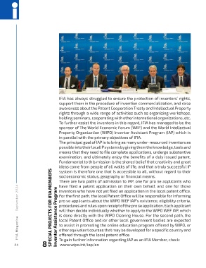 IFIA Magazine September 2024 SPECIAL PROJECTS FOR IFIA MEMBERS Inventor Assistance Program pro se applicants about the WIPO WEF IAP’s existence, eligibility criteria,