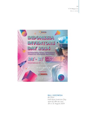 129 IFIA Magazine March 2024 BALI, INDONESIA IID 2024 Indonesia Inventors Day www.iid-official.com/ 28 to 31 August 2024