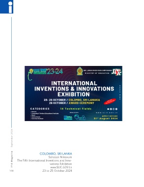 IFIA Magazine September 2024 COLOMBO, SRI LANKA Sahasak Nimavum vations Exhibition www.SLIC.GOV.Lk 23 to 25 October 2024 108 The Fifth International Inventions and Inno-